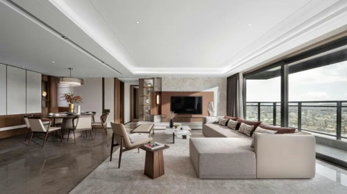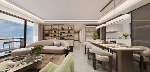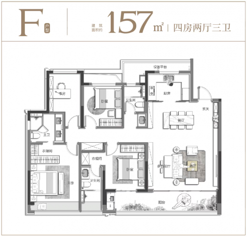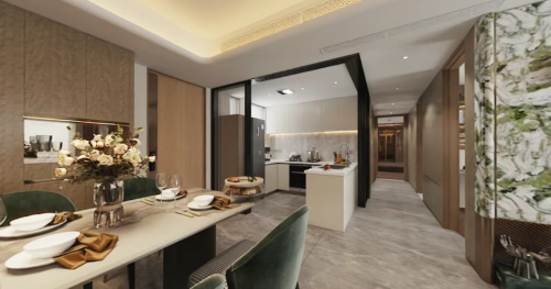 约157㎡环景大平层:同样为类一梯一户设计,将归家的尊崇感与仪式感直接拉满;大尺度奢阔空间营造,堪比170㎡+居住体验,无论是二胎家庭还是三代同堂家庭皆游刃有余,以宽境尺度,承载生活无限可能。厨房/餐厅/客厅/阳台无界相连,形成LDKB一体化超级交互空间,家庭欢聚、亲子游戏、观影互动,上演温馨的生活日常。