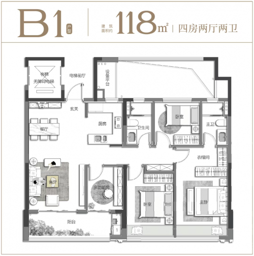 约118㎡改善四房: 类一梯一户设计,告别候梯拥挤,开门即入专属过渡空间,归家仪式感从第一步拉满;动静分区清晰,日常欢聚场景与私密栖居场景互不干扰,孩子玩耍、长辈休憩皆能从容安放;约12.4米南向四开间面宽,搭配约6米宽境阳台,清晨阳光漫进房间,午后远眺观景、莳花弄草,让生活与自然无缝衔接;