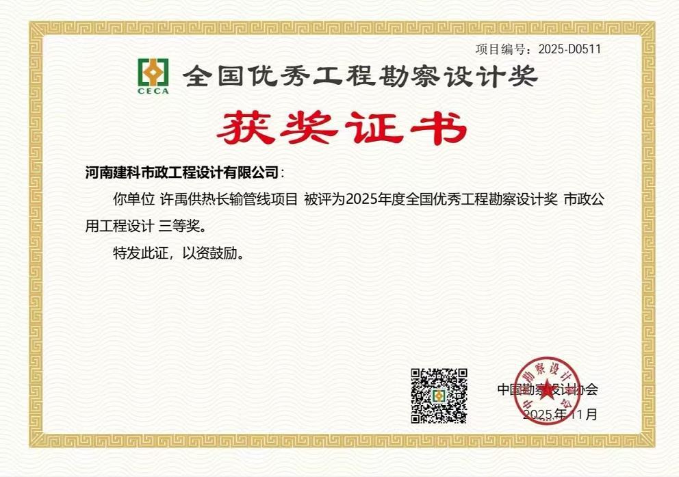 许禹供热管线项目荣获“全国优秀工程勘察设计奖”