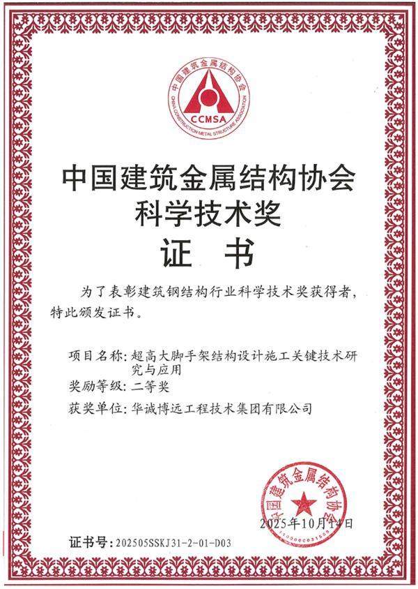 华诚博远工程技术集团公司与中建一局集团建设发展有限公司等企业合作研发的科技成果“超高大脚手架结构设计施工关键技术研究与应用”获得2025年中国建筑金属结构协会科学..